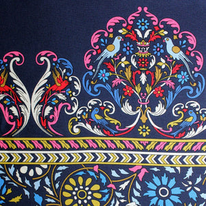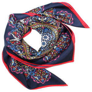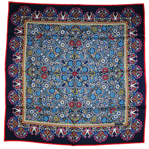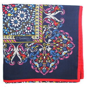 Women collection - Genuine E. Marinella scarf, stunning print, navy red blue bird and floral design, red border, twill silk foulard, hand made in Italy. Authentic E. Marinella women collection.