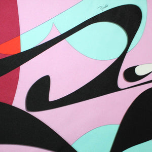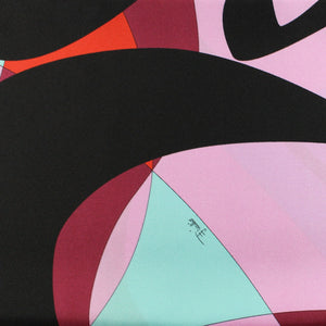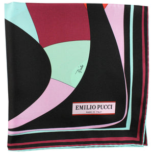 New: Genuine Emilio Pucci scarf, black / maroon / pink design, twill silk, large 36" square foulard, hand rolled borders, made in Italy. Authentic Emilio Pucci women fashion accessories at outlet prices.