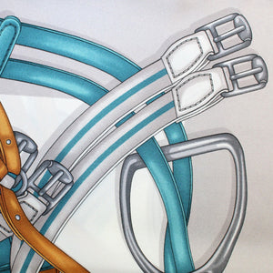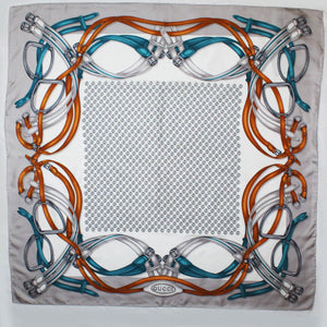 Original Gucci scarf, Gray / Turquoise / Brown equestrian belts design, twill silk square scarf, hand rolled borders, made in Italy. Gucci women collection scarves, shawls and wraps at outlet prices.