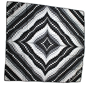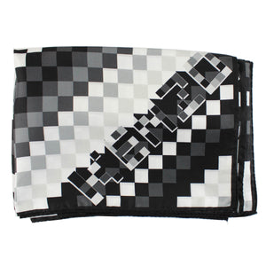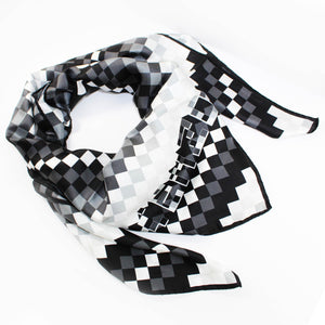 Authentic Kenzo scarf with black gray white squares geometric design with Kenzo logo, large 47" square square scarf, twill silk, hand made in Italy. New Kenzo women collection, discount designer women scarves online.