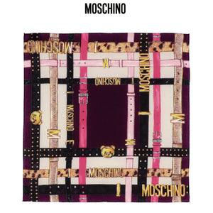 SALE: Genuine Moschino scarf, signature belts design, pink, large 35" square, twill silk, made in Italy. Authentic Moschino scarves, women collection at outlet prices.