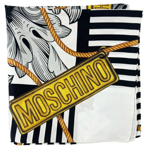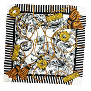 - SALE - Genuine Moschino scarf, black white with ornamental, cord with tassel design and gold Moschino logo hangers, silk large 35" square, hand stitched borders, made in Italy. Authentic Moschino scarves and accessories, women collection at outlet prices.