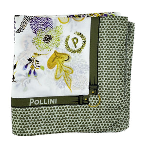 Genuine Pollini scarf, green floral design with mini hearts border, silk, made in Italy. Authentic discount designer scarves and accessories, women collection at outlet prices.