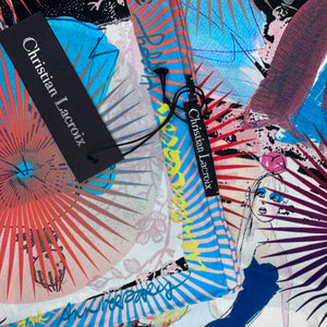 Authentic Christian Lacroix scarf, fashion models 'Happy 30th Anniversary' design, twill silk square head scarf, hand stitched borders, made in Italy. Genuine women designer scarves by Christian Lacroix, discount luxury Italian women soft accessories.