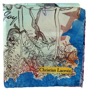 Genuine Christian Lacroix scarf, "Love Tenderness Affection" design, twill silk large square scarf, hand stitched borders, made in Italy. Genuine silk square women scarf by Christian Lacroix, luxury Italian women scarves and shawls at outlet prices.
