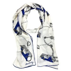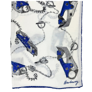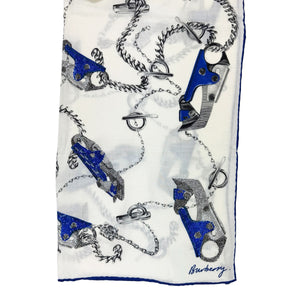 SALE - Ultra Luxury, special edition: Authentic Burberry scarf, cashmere/ silk with hand painted/ crystals detail white with gray silver chain and royal blue 'Knight bag hardware' novelty design, hand stitched borders, made in Italy. Genuine Burberry scarves, accessories and handbags at outlet prices.