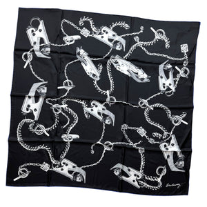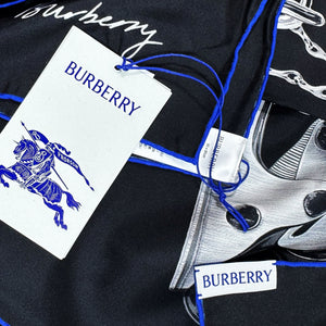 - SALE - Authentic Burberry scarf, twill silk 36" square, black knight clip chain design, with royal blue hand stitched border, made in Italy. Genuine Burberry scarves, accessories and handbags at outlet prices.