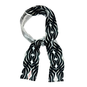Genuine Furla bandeau scarf (twilly), light gray/ black butterfly design, light weight twill silk, made in Italy. Authentic Furla women designer scarves, Italian quality accessories at outlet prices.