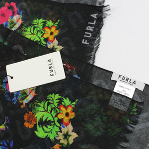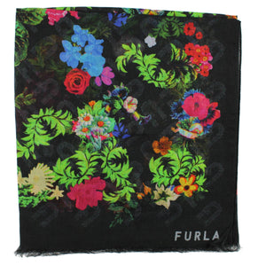 Genuine Furla scarf, floral design, black background, lightweight (sheer) modal/ silk shawl, short eyelash fringe, made in Italy. Authentic Furla women designer scarves, Italian quality at outlet prices.