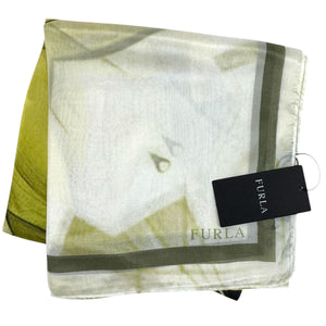 New: Genuine Furla scarf, chartreuse olive white floral design, light weight silk, hand stitched borders, made in Italy. Authentic Furla women designer scarves, Italian quality accessories at outlet prices.