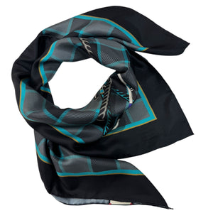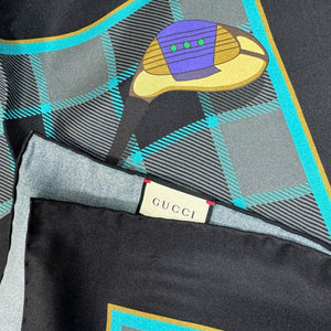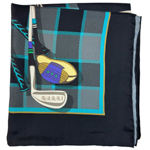 Women Collection: Genuine Gucci scarf, black gray golf clubs design, twill silk, large square scarf, hand stitched borders, made in Italy. Gucci women collection scarves, shawls and wraps at outlet prices.