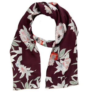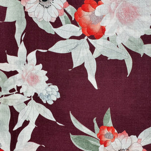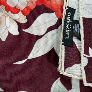 Authentic Leonard scarf, maroon floral design,lightweightcashmere silk shawl, made in Italy, hand-stitched edges (no fringe). Genuine Leonard Paris women scarf, discount luxury women designer scarves at outlet prices, Italian designer shawls, wraps and scarves.