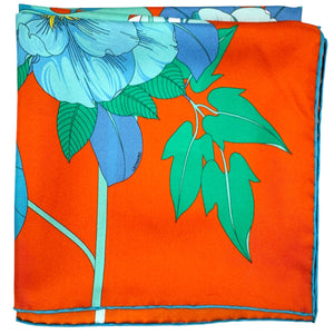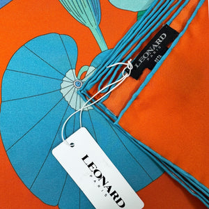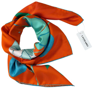 Authentic Leonard Paris scarf, stunning orange teal floral design, twill silk, hand stitched borders, made in Italy. Genuine Leonard Paris women scarf, vibrant colors, top quality Italian made scarves and accessories.