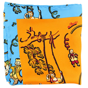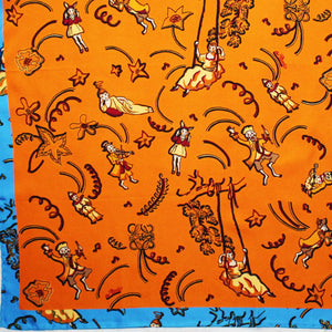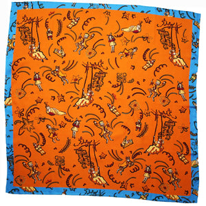 Original Loewe scarf, orange blue design, in collaboration with Paula's Ibiza, large twill silk large square foulard, hand stitched edges, made in Italy. Genuine Loewe women collection. Discount designer scarves at outlet prices: shop Loewe scarves.