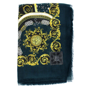 Fall/ Winter: Genuine Versace scarf, teal gold silver ornamental/ baroque design, fancy cashmere/ modal shawl, short eyelash fringe, made in Italy. Genuine Versace collection - women designer scarves.