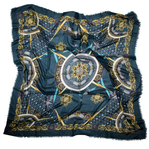 Category: 150-200, 2022fall, 2022winter, baroque, cashmere, dark blue, gold, large square, scarf, shawl, square, teal, Versace, woman