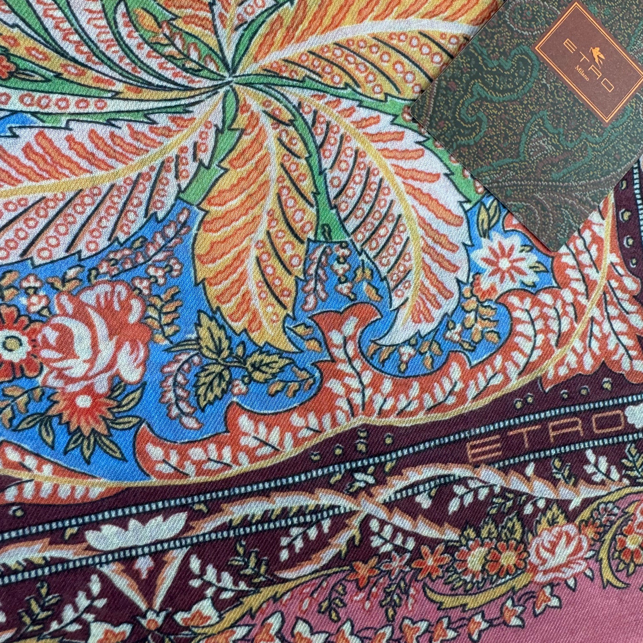 Genuine Etro scarf, pink peach floral ornamental and some lime green paisley, very soft and fancy lightweight modal/ silk, extra large 55" square, short eyelash fringe, made in Italy. Authentic Etro women collection at outlet prices.