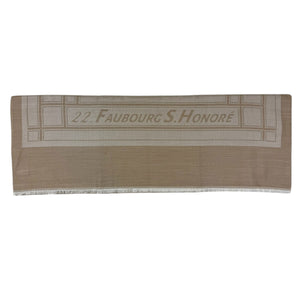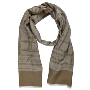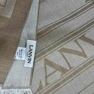 Genuine Lanvin scarf, signature dark beige/ light gray design with logo pattern, soft wool/ modal/ silk, short eyelash fringe, made in Italy. Authentic Lanvin scarves, women collection accessories at outlet prices.