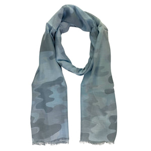Genuine Lanvin scarf, light blue/ light gray camo design, lightweight soft modal/ cashmere, short eyelash fringe, made in Italy. Authentic Lanvin scarves, women collection accessories at outlet prices.