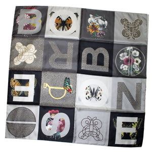 2025 Collection - Genuine Borbonese scarf, gray black patch logo design, light weight twill silk, hand stitched borders, made in Italy. Authentic Borbonese women designer scarves, Italian quality accessories at outlet prices.