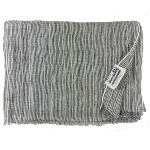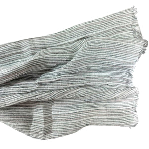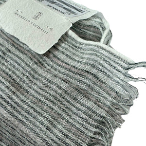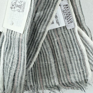 - SALE - Genuine Brunello Cucinelli scarf, striped design with dark gray, white, light pink with silver (metal) white and light pink detail, extra long, linen blend, short fringe, made in Italy. Authentic Brunello Cucinelli scarves and accessories at outlet prices.