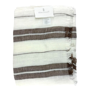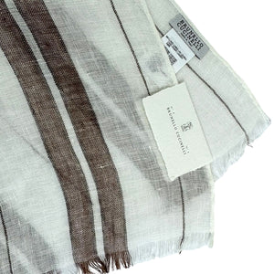 Luxury - Genuine Brunello Cucinelli scarf, extra long, white brown stripes, luxury linen blend, short fringe, made in Italy. Authentic Brunello Cucinelli scarves and accessories at outlet prices.