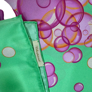 Genuine Chopard scarf, vibrant mint green with pink happy bubbles design, organic twill silk 36" square foulard, hand rolled borders, made in Italy. Great luxury gift for her, comes with Chopard gift box. Chopard is a high-end fashion brand from Geneve, Switzerland, specializing in high-end women accessories, watches and jewelry.