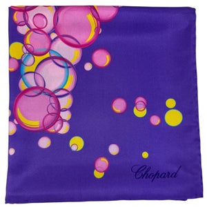 Genuine Chopard scarf, vibrant purple happy bubbles design, organic twill silk foulard, hand rolled borders, made in Italy. Great luxury gift for her, comes with Chopard gift box. Chopard is a high-end fashion brand from Geneve, Switzerland, specializing in high-end women accessories, watches and jewelry.