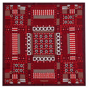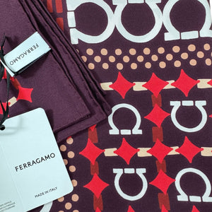 SALE - Authentic Salvatore Ferragamo scarf, bordeaux red 'Gancini' design, hand stitched borders, large twill silk foulard, made in Italy. Authentic discount Salvatore Ferragamo designer scarves at outlet prices.