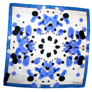 New: Genuine Furla scarf, royal blue watercolors design, light weight silk, hand stitched borders, made in Italy. Authentic Furla women designer scarves, Italian quality accessories at outlet prices.