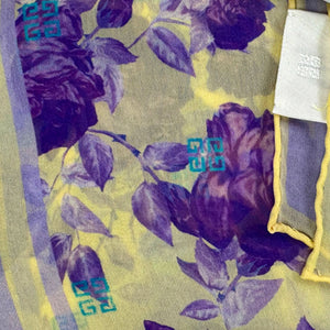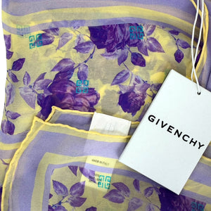 Genuine Givenchy scarf, yellow purple roses floral design with 4G logo, chiffon silk, hand stitched edges, made in Italy. Authentic Givenchy women collection online at outlet prices. Latest Givenchy designs at huge discounts, shop now: Givenchy scarves.