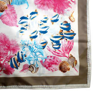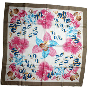 SALE - Women collection: Genuine Kiton scarf, twill silk, white taupe pink sea life print, hand stitched borders, made in Italy. Authentic Kiton women accessories and scarves at outlet prices.