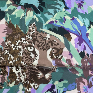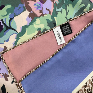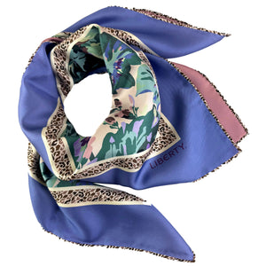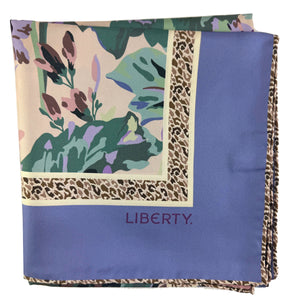 Genuine Liberty scarf, lilac leopard design, twill silk 36" square foulard, hand stitched borders, made in Italy. Authentic Liberty scarves, women collection accessories at outlet prices.