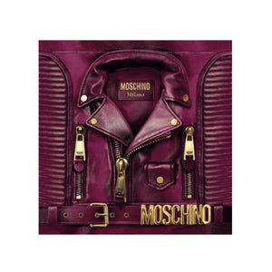 SALE -- Genuine Moschino scarf, stunning leather jacket design in magenta, large 35" square foulard, twill silk, made in Italy. Authentic discount Moschino scarves, women collection at outlet prices.
