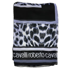 Genuine Roberto Cavalli scarf, light gray/ white black with some light dusk purple hues, leopard design, chiffon silk, extra large 54" square, hand stitched borders, made in Italy. Authentic Roberto Cavalli women collection online. Genuine Robert Cavalli.