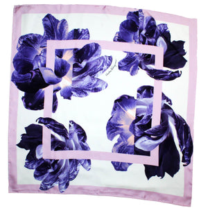 - SALE - Genuine Salvatore Ferragamo scarf, Pink / Purple 'Tulipani' design, large twill silk square scarf, hand stitched edges, made in Italy. Authentic Salvatore Ferragamo women collection at outlet prices.