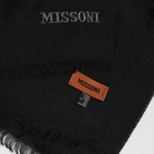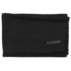 Authentic Missoni scarf, dark gray/ black blend, unisex, embroidered 'Missoni' logo, light weight cashmere/ silk blend, short eyelash fringe, made in Italy. Genuine Missoni women scarves at outlet prices, quality brand name shawls made in Italy.