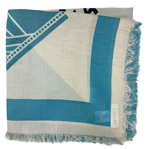 Genuine Lanvin scarf, signature blue light gray "22 Rue du Faubourg Saint-Honoré' design, soft modal cashmere, short eyelash fringe, made in Italy. Authentic Lanvin scarves, women collection accessories at outlet prices.