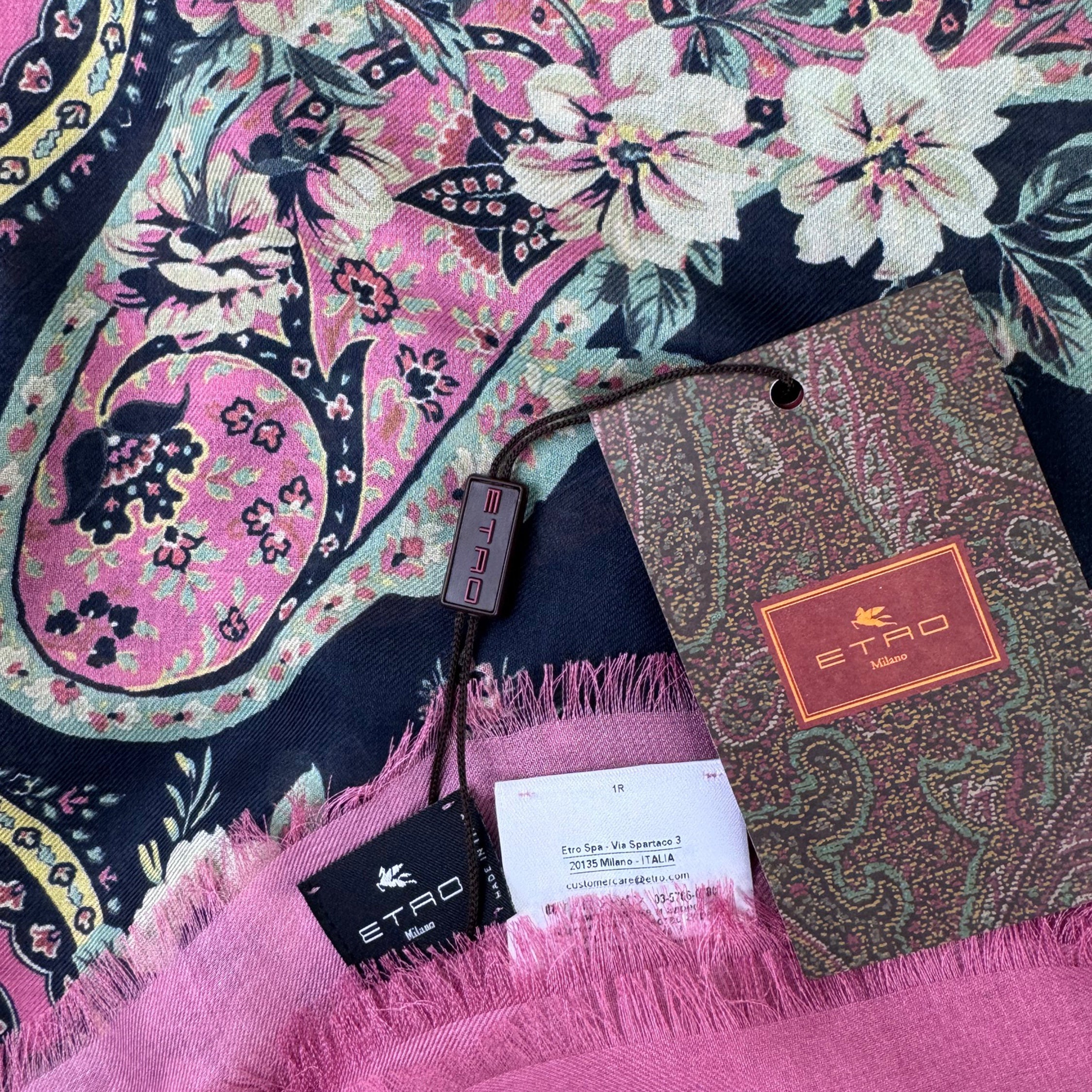 Genuine Etro scarf, pink navy paisley and floral, very soft and fancy lightweight modal/ silk, extra large 55" square, short eyelash fringe, made in Italy. Authentic Etro women collection at outlet prices.