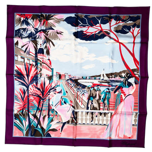 Authentic Chopard scarf, violet abstract 'Riviera' design, twill silk foulard, hand rolled borders, made in Italy. Great luxury gift for her, comes with Chopard gift box. Chopard is a high-end fashion brand from Geneva, Switzerland, specializing in high-end women accessories, watches and jewelry.