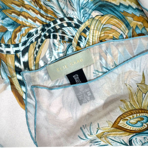 - SALE - Authentic Elie Saab scarf, white/ olive/ teal floral design, chiffon silk, hand stitched borders, made in Italy. Genuine Elie Saab collection, discount women designer scarves/ stola and shawls.