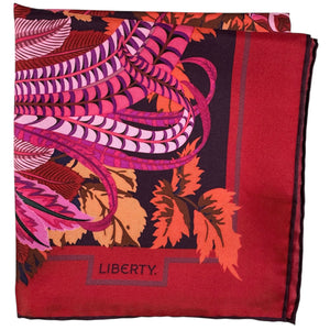 Genuine Liberty scarf, bordeaux purple Peacock design, twill silk 36" square foulard, hand stitched borders, made in Italy. Authentic Liberty scarves, women collection accessories at outlet prices.