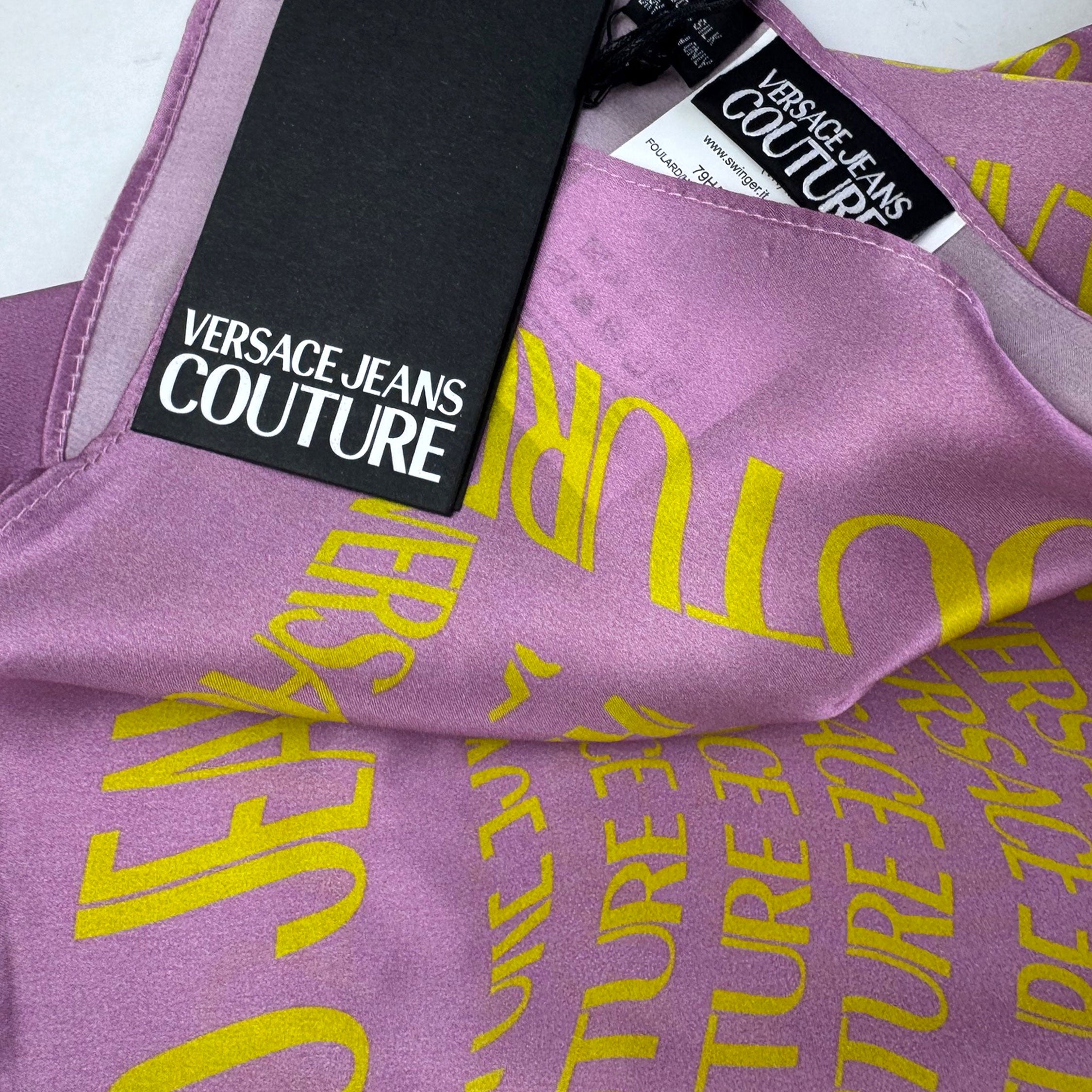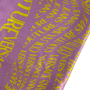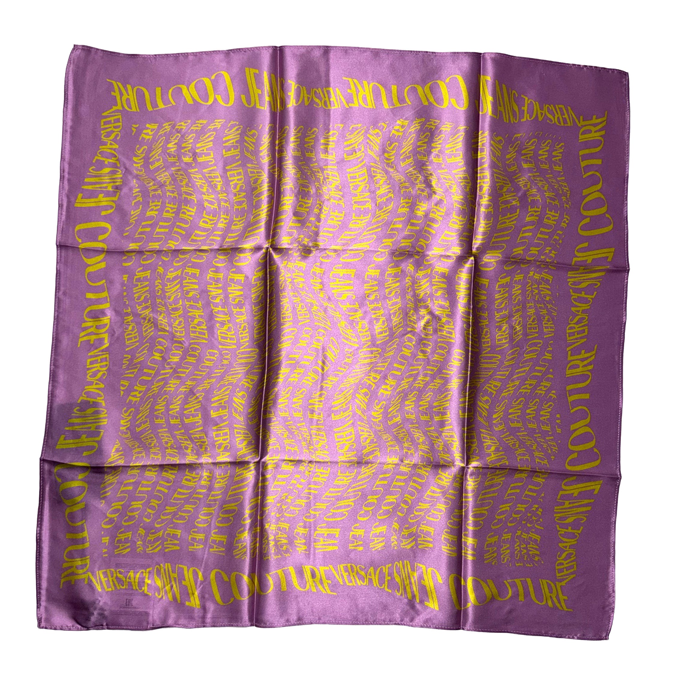 Women collection: Authentic Versace silk scarf, Logomania design,  36x36"/ 90x90cm, no fringe, light weight satin silk, Versace Jeans Couture collection, imported. Versace collection - women scarves at outlet prices.