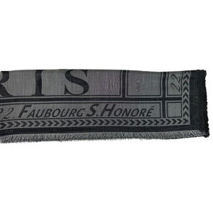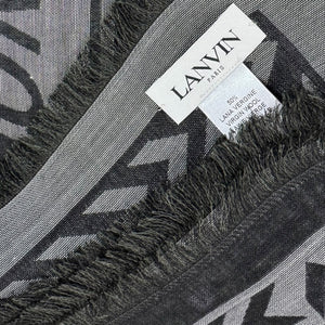 High quality women designer scarves: Genuine Lanvin scarf, signature dark gray "22 Rue du Faubourg Saint-Honoré' design, soft wool silk, short eyelash fringe, made in Italy. Authentic Lanvin scarves, women collection accessories at outlet prices.