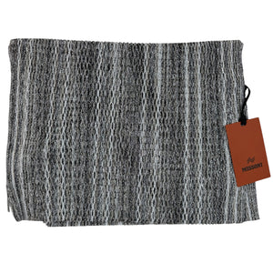 Women collection: Authentic Missoni scarf, gray black silver pattern, loose knit, viscose fabrics, fringe, made in Italy. Genuine Missoni scarves at outlet prices, women collection, quality designer shawls, made in Italy.