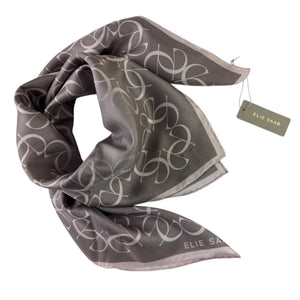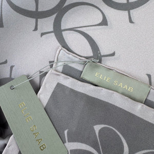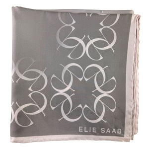 Genuine Elie Saab scarf, 'ELIE SAAB' signature gray with a tiny bit mauve pink hue logo letters design, elegant timeless design, twill silk large square scarf, made in Italy, hand stitched edges. Genuine Elie Saab collection, discount women designer scarves.