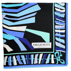 Genuine Emilio Pucci scarf, Blue/ Aqua / Black / White signature design, twill silk, large square foulard, hand rolled borders, made in Italy. Authentic Emilio Pucci accessories at outlet prices.