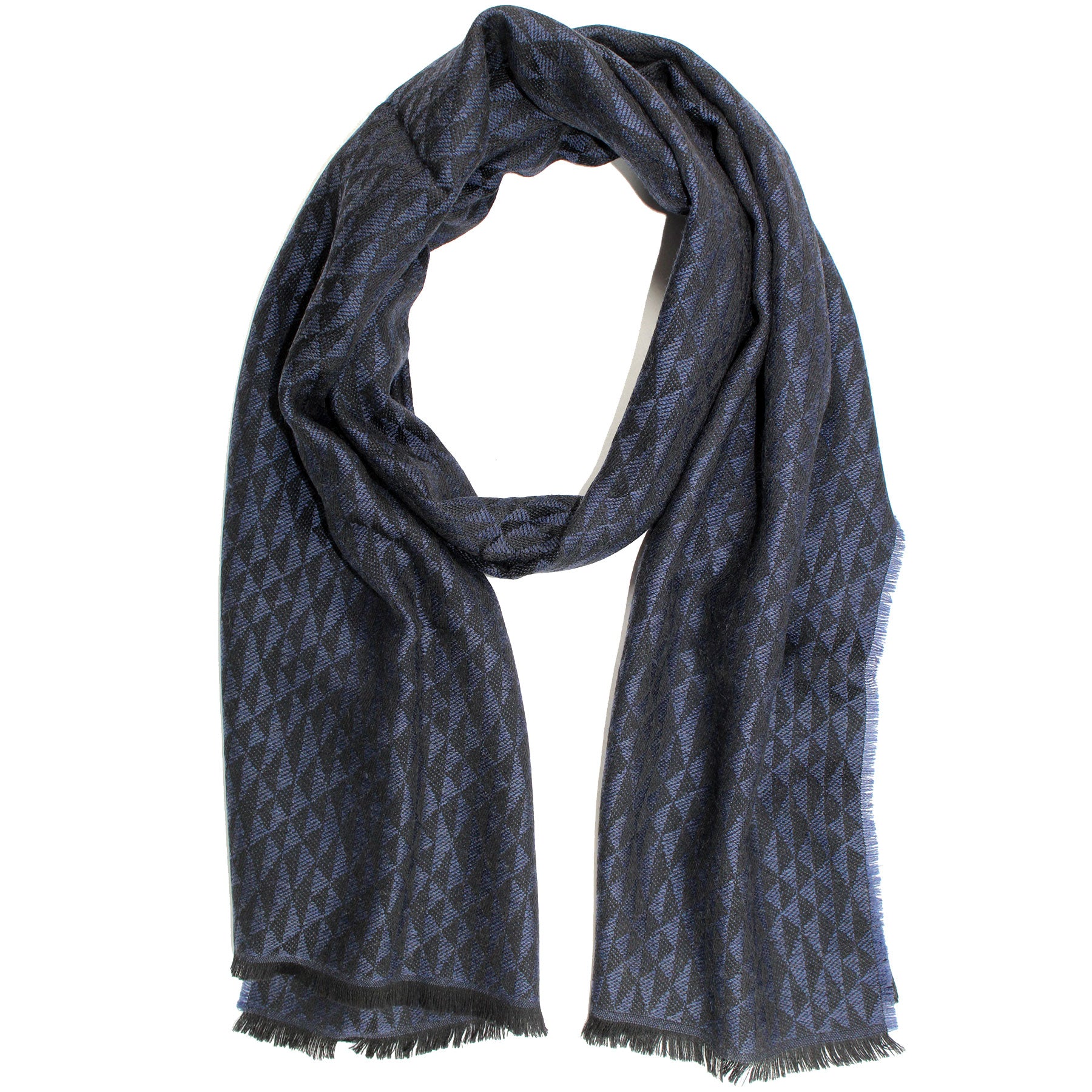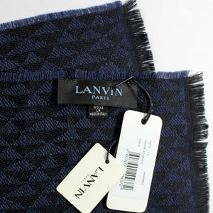 - SALE - Authentic Lanvin scarf, black with modest dark purple triangle pattern design, fancy wool, short eyelash fringe, hand made in Italy. Authentic Lanvin scarves, unisex scarves at outlet prices.