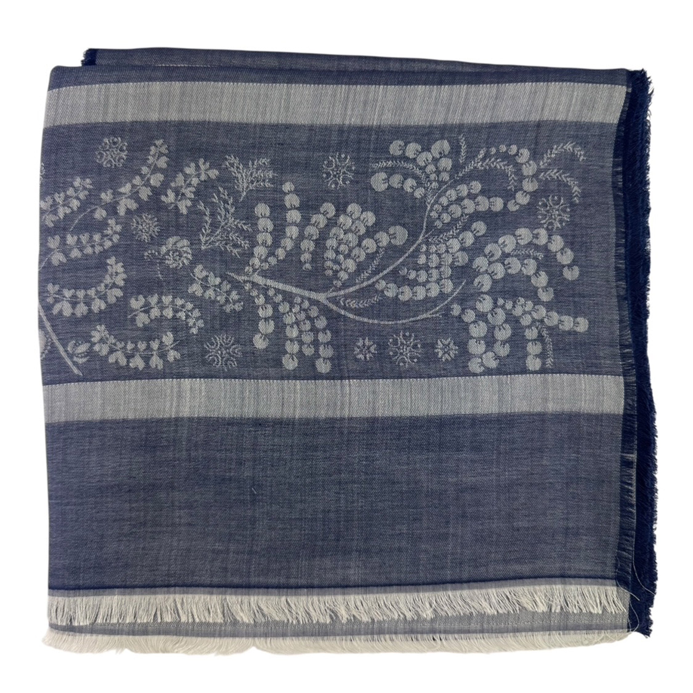 SALE - Genuine Lanvin oblong scarf, signature blue gray design with floral pattern, soft wool/ modal/ silk, short eyelash fringe, made in Italy. Authentic Lanvin scarves, women collection accessories at outlet prices.