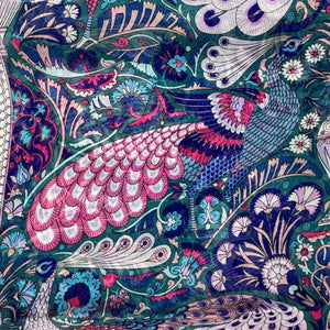 - SALE - Genuine Liberty scarf, pink dark blue green peacock design, chiffon silk, no fringe, made in Italy. Authentic Liberty scarves, women collection accessories at outlet prices.